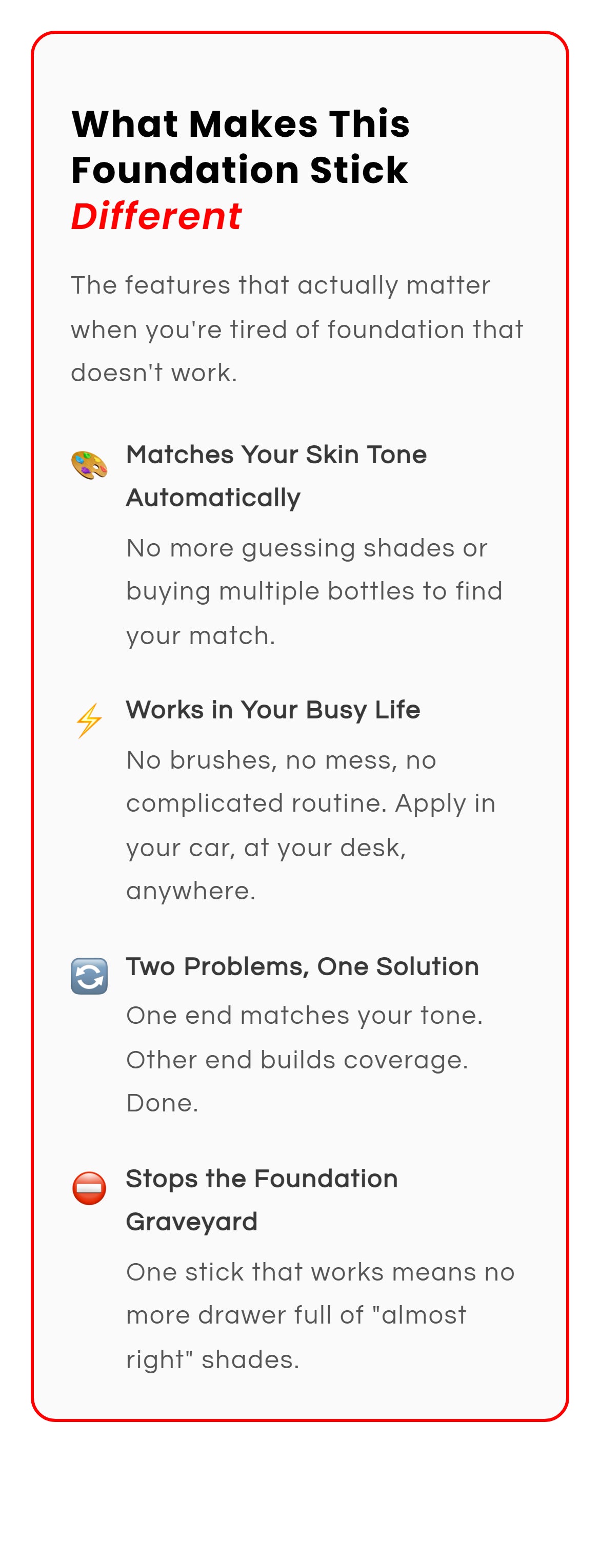 Full coverage that evens your skin tone and hides redness, dark spots, melasma, and fine lines.