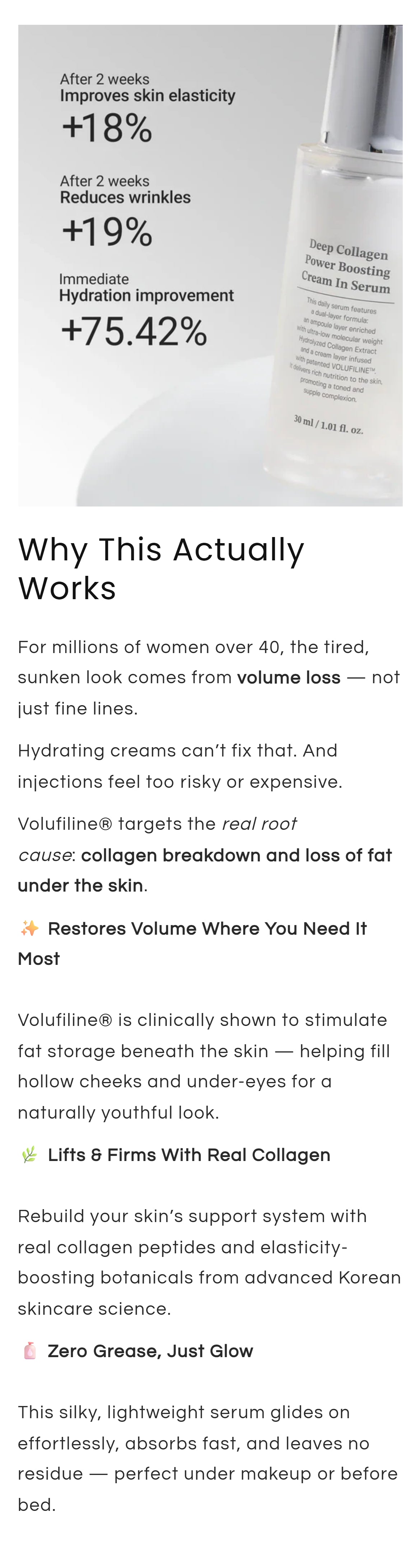 Most serums only hydrate the surface of your skin, that's why they don't fix volume loss. This serum contains Volufiline, a clinical-studied ingredient that works at the fat cell level to restore volume in hollow areas.